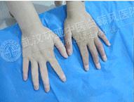 四处求医无果,何女士明显没有了第一次看病时的热情,对自己已经快要失去希望,经过帅海林医生的细心开导和专业检测,最终决定再给自己一次机会,愉快的接受治疗。第一次治疗的效果还是蛮不错的,手指的白斑颜色转淡,面积不再扩大,白斑中间有毛囊性给点长出,效果比较明显。